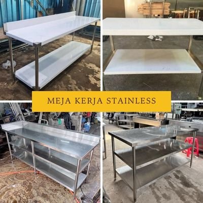 Kuat, rapi, dan tahan lama. Tersedia model meja kerja, meja preparation, dan meja dengan sink.