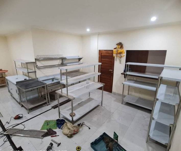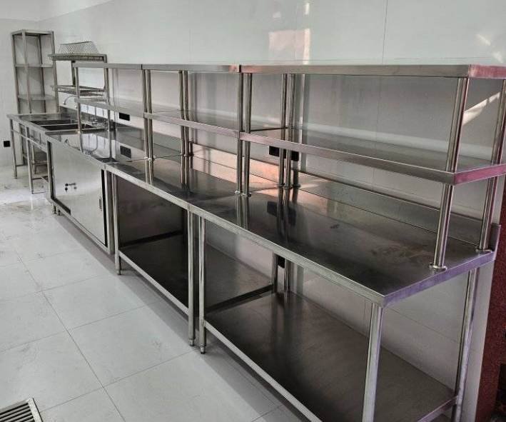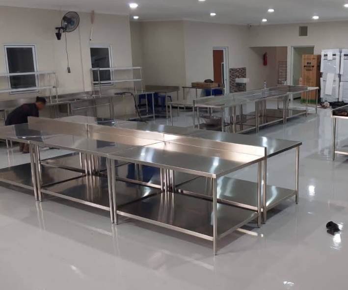 Kuat, rapi, dan tahan lama. Tersedia model meja kerja, meja preparation, dan meja dengan sink.