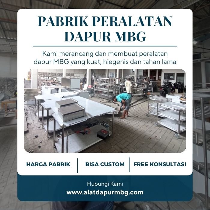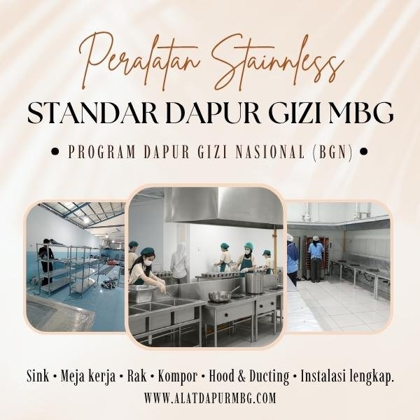 Kami adalah produsen peralatan dapur stainless berpengalaman untuk berbagai proyek besar, termasuk program Dapur Gizi Nasional (BGN)